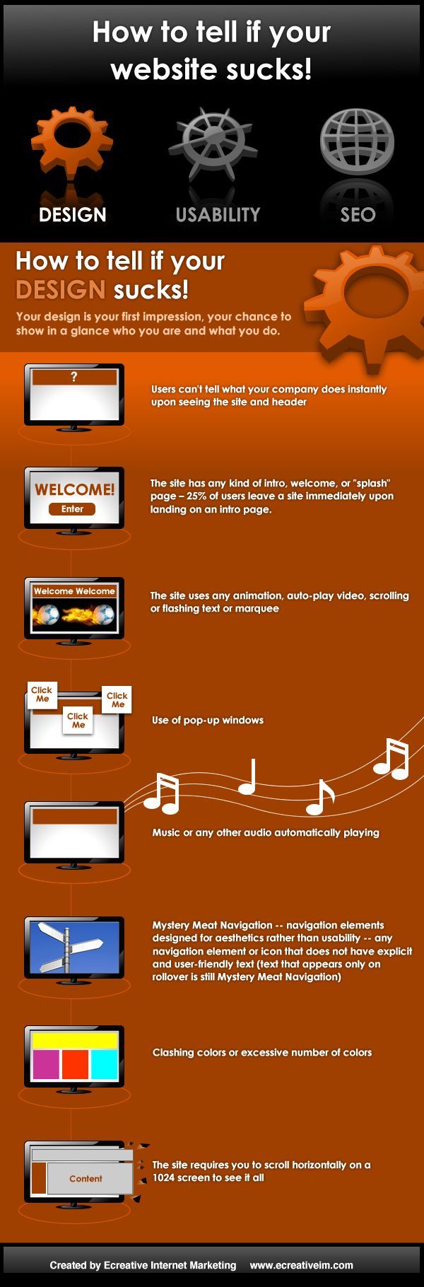 Your design is a person’s first impression of your business. this is your chance to show in a glance who you are and what you do. Users can’t tell what your company does instantly upon seeing the site and header. The site has any kind of intro, welcome, or “splash” screen. 25% of users will leave a site immediately upon landing on an intro page. The site uses any animated gif’s, auto-play video, scrolling or flashing text or marquee. Use of pop-up windows. Music or any other audio automatically playing (unless you are a musician or have an entertainment site). Clashing colors or excessive number of colors. The site requires you to scroll horizontally on a 1024 screen to see it all.